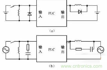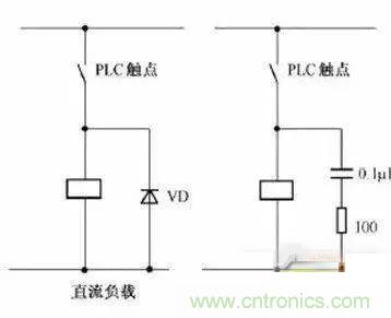 當(dāng)PLC輸入輸出端接有感性負載元件時,直流輸出的續(xù)流管保護(直流電路兩端并聯(lián)續(xù)流二極管),交流輸出阻容吸收電路。