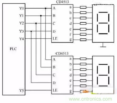 上圖兩只CD4513的數(shù)據(jù)輸入端A-D共用PLC四個輸出端Y0-Y3,A為最底D為最高,LE 為寄存輸入端,當(dāng)LE 為高電平時,輸入數(shù)據(jù)將存在芯片內(nèi)的寄存器中,并將其譯碼后顯示出來。如PLC使用繼電器輸出模塊時,與CD4513相連的輸出各端在接一個下拉電阻,避免輸出繼電器斷開的時候CD4513輸入端懸空。