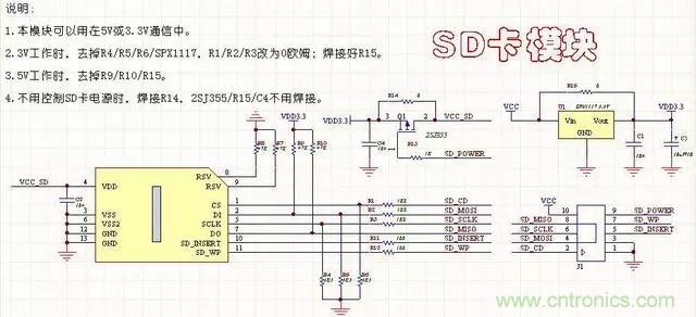 6、SD卡模塊電路(帶鎖)本電路與SD卡的封裝有關(guān),注意與封裝對(duì)應(yīng)。此電路可以通過端口控制SD卡的電源,比較完善,可以用于5V和3.3V。但是要注意,有些器件的使用,5V和3.3是不一樣的。