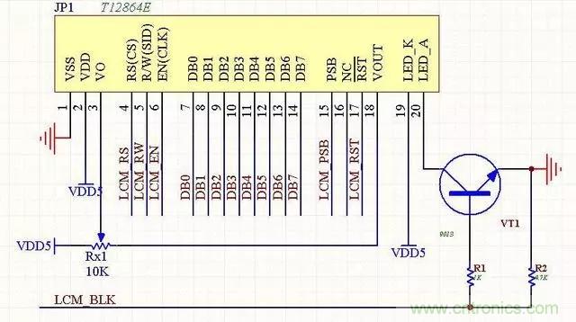 7、LCM12864液晶模塊(ST7920)本電路是常見的12864電路,價(jià)格便宜,帶中文字庫(kù)。可以通過PSB端口的電平來設(shè)置其工作在串口模式還是并行模式,帶背光控制功能。