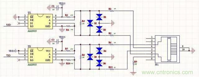 9、全雙工RS485電路(帶保護(hù)功能)帶有保護(hù)功能,全雙工4線通信模式,適合遠(yuǎn)距離通信用。