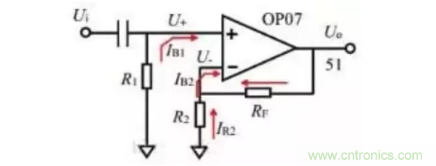 如果 IB1=IB2,那么選擇 R1=R2//RF,可以使電流形成的失調(diào)電壓會消失。但實際中IB1=IB2很難滿足