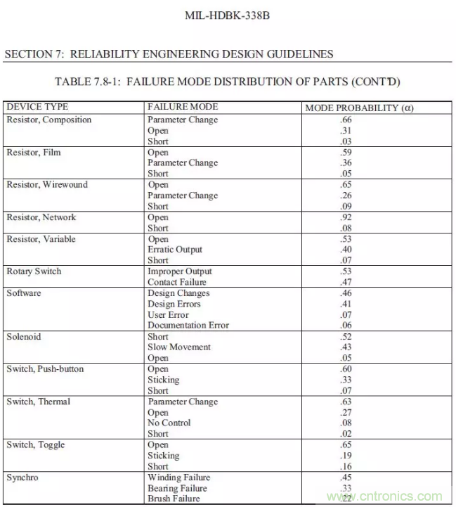 【導讀】以下總結摘錄MIL-HDBK-338B,美軍可靠性設計手冊來為FTA(故障樹)做一些支持。如果我們想要進行FTA的定量分析,一定要把可靠性預測先做完,在可靠性前一定要把電壓分布表和溫度分布先進行初步的運算,通過下面的的表格,大概可以預計失效發(fā)生的時候故障的分配比例。
