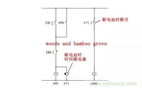 2 ,停止時,按下停止按鈕SB0,交流接觸器KM1和斷電延時時間繼電器KT1斷電釋放,KT1的斷電延時斷開觸點經過設定的時間后復位斷開。交流接觸器KM2斷電釋放。實現(xiàn)了交流接觸器KM1斷電釋放一段時間后,交流接觸器KM2才斷電釋放的控制要求。