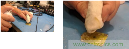 接下來用一些助焊劑清潔劑和一小塊布來清潔電路板。如下圖所示,將助焊劑清潔劑噴在布料上。用力壓住電路板,同時(shí)用沾有助焊劑清潔劑的濕布以畫圈的方式清潔電路板。