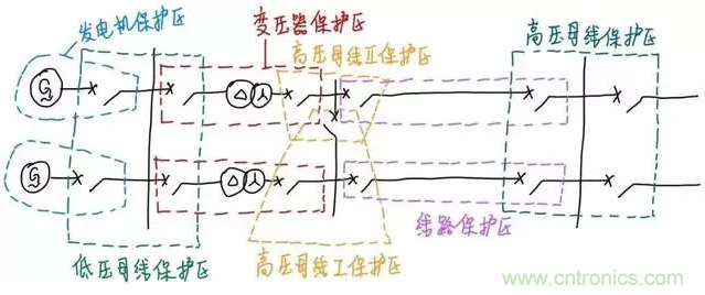 然后是變壓器連接的高壓母線。這條母線是分段的,我們希望哪段母線發(fā)生故障就只切這段母線而不切另一段,所以每段母線都需要一個(gè)單獨(dú)的保護(hù)區(qū)。按照上文的分區(qū)原則,我們可以很容易地確定出高壓母線和輸電線路的保護(hù)區(qū),如下圖:
