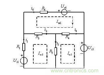 即為該電路的網(wǎng)孔方程,顯然,由此三個方程,可求解網(wǎng)孔電流。