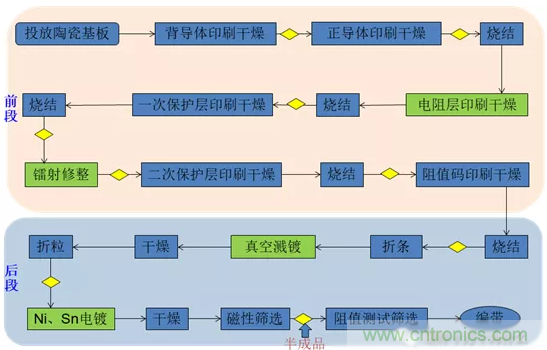 常規(guī)厚膜片式電阻的完整生產流程大致如下: