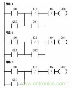 2. 單向順序停止控制電路就是要求按一定順序停止已經(jīng)執(zhí)行的各機(jī)構(gòu)。只有Q0.2被停止后才可以停止Q0.1,若想停止Q0.0,則必須先停止Q0.1。I0.4為急停按鈕。