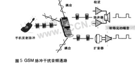當(dāng)手機與基站通訊,或兩個手機彼此接近時,發(fā)射脈沖通過擴音器,揚聲器,或頭戴式耳機線傳人音頻通路。見圖5。
