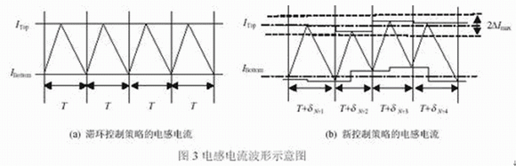 [page] 如圖2所示為一種常見的DC/DC控制策略——滯環(huán)控制策略。該控制策略限定了電感電流波動的最大值ITop和最小值Ibotton,電感電流波形如圖3a所示。此時,電感電流為周期的,變換器有固定的開關(guān)周期T。設(shè)電感電流為ILp(t),則