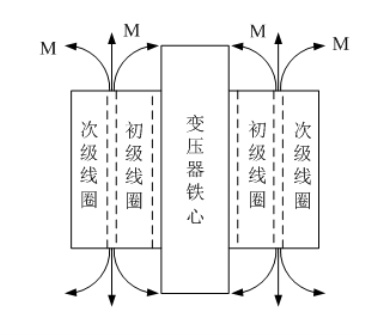 圖9是開關(guān)電源變壓器產(chǎn)生的漏磁通的原理圖。開關(guān)電源變壓器的漏磁通大約在5%~20%之間,反激式開關(guān)電源變壓器為了防止磁飽和,在磁回路中一般都留有氣隙,因此漏磁通比較大,即:漏感比較大。因此,產(chǎn)生漏感干擾也特別嚴重,在實際應(yīng)用中,一定要用銅箔片在變壓器外圍進行磁屏蔽。從原理上來說,銅箔片不是導磁材料,對漏磁通是起不到直接屏蔽作用的,但銅箔片是良導體,交變漏磁通穿過銅箔片的時候會產(chǎn)生渦流,渦流產(chǎn)生的磁場方向正好與漏磁通的方向相反,是部分漏磁通被抵消,因此,銅箔片也可以起到磁屏蔽的作用。