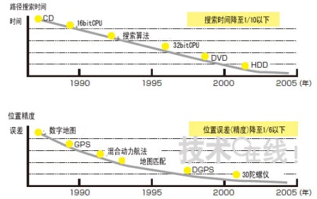 圖3:性能的變化圖在從導航儀向語音導航儀、多媒體型導航儀轉(zhuǎn)變的過程中實現(xiàn)了大幅度的高速化·高精度化。