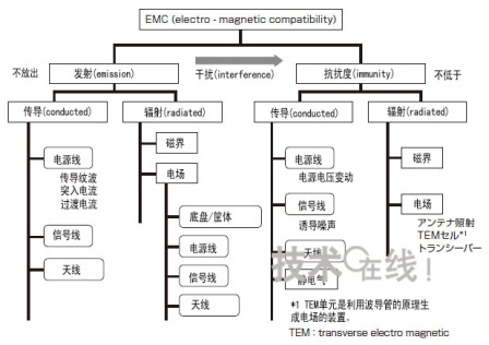 圖6給出的樹形圖對于理解EMC的整體結(jié)構(gòu)很有幫助,本公司的內(nèi)部培訓也經(jīng)常使用。這是按照發(fā)射/抗擾度、傳導/輻射的組合,把EMC分成四個大類進行整理的方法。其中,在設計階段的EMC研究和測量精度方面,尤其需要注意的是電場的輻射。
