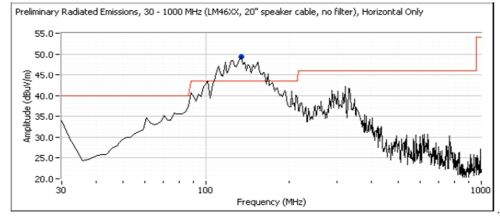 圖3.沒有邊沿速率控制的擴展頻譜D類放大器。器件在EMI測試中,在沒有使用任何濾波器的情況下驅(qū)動20英寸長的揚聲器電纜,其結(jié)果符合FCCB級的EMI限制。