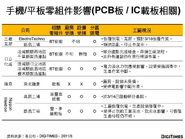 在手機/平板用PCB、IC載板材料BT樹脂等相關(guān)零組件方面,包含三菱瓦斯化學、日立化成、藤倉、Nippon Mektron等日廠旗下工廠受地震影響作業(yè)中斷,停止生產(chǎn)。