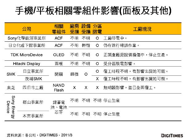 在面板、開關(guān)、存儲器、電池芯、異方性導電膜(ACF)等手機/平板相關(guān)零組件方面,除東芝位于四日市生產(chǎn)NAND Flash的工廠未受到日本311地震沖擊,其余包含TDK、日立顯示、日立化成、SMK、Sony化學、Sony Energy Device等業(yè)者的生產(chǎn)工廠,分別受到廠房、設(shè)備受損或停止生產(chǎn)的大小不等的影響。