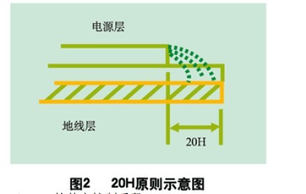 為了減小電源的邊緣輻射,電源/地平面應(yīng)遵循20H設(shè)計(jì)原則,即地平面尺寸比電源平面尺寸大20H(見圖2),這樣邊緣場輻射強(qiáng)度可下降70% 。