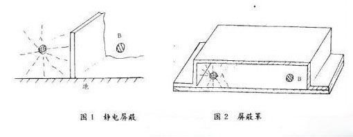 屏蔽方法:將一塊金屬板置于兩個(gè)被屏蔽的電路中間,并使各金屬板與地作電氣連接,如圖1所示。這樣從一點(diǎn)發(fā)出的電力線均被屏蔽板擋住,即起到靜電屏蔽作用。
