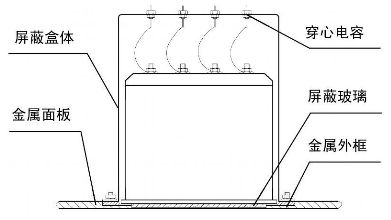 儀表窗口對設(shè)備來說是比較大的泄漏口,必須采取有效的措施將其屏蔽,為此采用加裝絲網(wǎng)屏蔽玻璃的方法對數(shù)字電流表、數(shù)字電壓表進行外部屏蔽。絲網(wǎng)屏蔽玻璃是由一種低阻抗的金屬絲網(wǎng)通過特殊工藝夾在兩層玻璃之間制成,絲網(wǎng)篩孔的密度決定其主要的屏蔽效能。如圖1 所示,由于玻璃周邊預(yù)留了10~ 20 mm 金屬絲網(wǎng)毛邊,通過螺裝金屬外框?qū)⑺o緊壓在機箱上,從而獲得連續(xù)的導電表面,以達到減少電磁泄露的目的。