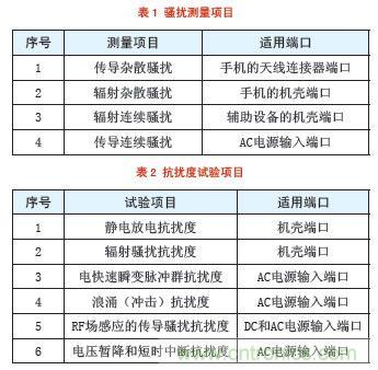 雖然手機(jī)的制式不同,但是電磁兼容要測試的項(xiàng)目相同,根據(jù)不同的要求來選擇需要測試的項(xiàng)目,電磁兼容測試項(xiàng)目見表1和表2。