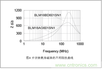 一般來說,片狀鐵氧體磁珠是以100MHz的阻抗值來決定其規(guī)格的。但與此同時, 也存在著諸多擁有相同阻抗值的不同產(chǎn)品,這是因?yàn)樗鼈兊那€形狀各不相同。圖4所示的就是其中一例。BLM18AG601SN1與 BLM18BD601SN1都是100MHz阻抗值為600Ω的片狀鐵氧體磁珠,但從它們的阻抗波形可以看出,與BLM18AG601SN1較為平穩(wěn)上升 的曲線相比,BLM18BD601SN1的曲線則呈急速上升的趨勢。