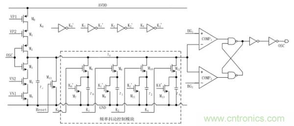 從(4)式可以看出,可以通過改變電容 Cc、充放電電流I 和電壓差值 BG2- BG1能夠?qū)崿F(xiàn)任意頻率的振蕩器。本文中所設(shè)計(jì)的周期性頻率抖動(dòng)振蕩器的中心頻率為100 kHz,抖動(dòng)范圍為±4 kHz。