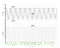 由圖1可以看出,頻率抖動(dòng)振蕩器由一個(gè)張弛振蕩器加上一個(gè)頻率抖動(dòng)模塊構(gòu)成。其工作原理:首先,開關(guān) S1閉合,電流源 I0給電容 Cc充電,充電剛開始時(shí)電容 Cc上極板的電壓小于 BG1和 BG2,RS 觸發(fā)器的輸出被置為低電平 0,當(dāng)電容上極板電壓 VA大于 BG2時(shí),RS 觸發(fā)器的輸出狀態(tài)處于保持狀態(tài),直到上極板電壓 VA大于 BG1之后 RS 觸發(fā)器的輸出翻轉(zhuǎn)被置為高電平1;此時(shí),開關(guān) S2導(dǎo)通,電流源 I1給電容Cc放電,當(dāng)VA減小到小于 BG1時(shí),RS 觸發(fā)器的輸出處于保持狀態(tài),當(dāng)VA減小到小于 BG2時(shí),RS 觸發(fā)器翻轉(zhuǎn)被置為低電平 0 ;于是,開關(guān) S1又閉合開始對(duì) Cc充電,如此周而復(fù)始,得到一個(gè)頻率固定的振蕩器。圖1中的電流源I0、 I1的電流相等,則振蕩器的占空比為 0.5。頻率抖動(dòng)控制模塊是通過計(jì)數(shù)器來周期性的切換加入到張弛振蕩器中充放電電容的大小,改變電壓 VA的充放電速度,從而來達(dá)到周期性的改變振蕩器頻率的目的,即實(shí)現(xiàn)了振蕩器頻率的抖動(dòng)。