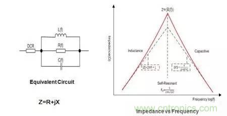 從等效電路中可以看到,當(dāng)頻率低于fL(LC諧振頻率)時(shí),磁珠呈現(xiàn)電感特性;當(dāng)頻率等于fL時(shí),磁珠是一個(gè)純電阻,此時(shí)磁珠的阻抗(impedance)最大;當(dāng)頻率高于諧振頻率點(diǎn)fL時(shí),磁珠則呈現(xiàn)電容特性。EMI選用磁珠的原則就是磁珠的阻抗在EMI噪聲頻率處最大。比如如果EMI噪聲的最大值在200MHz,那你選擇的時(shí)候就要看磁珠的特性曲線,其阻抗的最大值應(yīng)該在200MHz左右。下圖是一個(gè)磁珠的實(shí)際的特性曲線圖。大家可以看到這個(gè)磁珠的峰值點(diǎn)出現(xiàn)在1GHz左右。在峰點(diǎn)時(shí),阻抗(Z)曲線的值與電阻(R)的相等。也就是說這個(gè)磁珠在1GHz時(shí),是個(gè)純電阻,而且阻抗值最大。