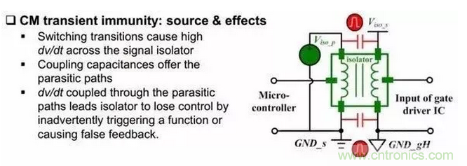 同時選隔離芯片的時候也需要注意一個參數(shù)叫做CM transient immunity(肯定會給的),這個參數(shù)最好大于開關(guān)瞬間,橋臂中點電平的變化速率。光耦隔離這個參數(shù)一般在30kV/us,磁耦在35kV/us,電容耦合在50kV/us(是不是絕望了,都比氮化鎵低,硅器件一般在10kV/us,Sic 30kV/us)。