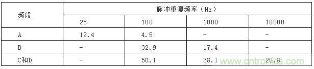 所謂相對脈沖特性指輸人周期性脈沖信號時,脈沖的重復(fù)頻率越高,其讀數(shù)越高,重復(fù)頻率低,讀數(shù)低。當(dāng)讀數(shù)不變時輸人脈沖的幅度和重復(fù)頻率的關(guān)系應(yīng)符合表4的規(guī)定。