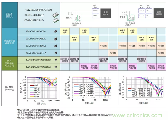 圖4所示為噪音濾波器MAF系列與貼片壓敏電阻的麥克風(fēng)線噪音對策事例及其效果。