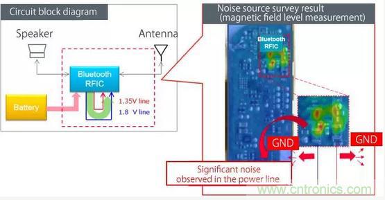圖5顯示了用于測量的測量環(huán)境以及測量與藍(lán)牙天線耦合的噪聲的結(jié)果。觀察到極高水平的噪聲,這需要噪聲抑制以降低水平。實(shí)現(xiàn)藍(lán)牙噪聲抑制時(shí),有兩個(gè)關(guān)鍵的實(shí)現(xiàn)區(qū)域。