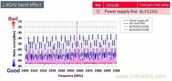 這些是在藍(lán)牙通信期間測量與天線耦合的噪聲頻譜的結(jié)果。將BLF02RD過濾器插入電源線。我們能夠?qū)⒄瓗г肼曁岣呒s5 dB,并驗(yàn)證BLF02RD濾波器是一種有效的解決方案。