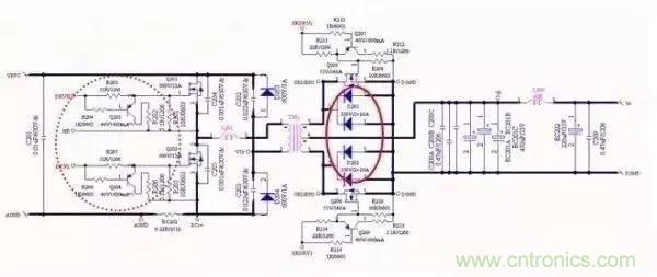 LLC電路大家最熟悉不過了,虛線圓圈是驅(qū)動(dòng)電路,在電路設(shè)計(jì)時(shí)緊靠MOS管放置,也就是說IC提供的驅(qū)動(dòng)只需要引二根線拉到驅(qū)動(dòng)電路,驅(qū)動(dòng)電路離MOS管近,避免被干擾(同時(shí)走線時(shí)也要注意驅(qū)動(dòng)干擾到敏感信號(hào),既是敏感信號(hào)也是干擾源);一旦驅(qū)動(dòng)被干擾電源可想而知。