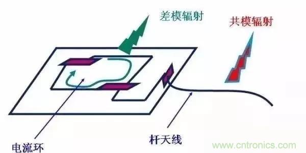 這個(gè)圖可能有些抽象,不過正好EMC是很難做到具體,需要給到我們一些啟示,可知:差模輻射是以環(huán)路的形式存在,而共模輻射是以天線的形式發(fā)射;因此正好印證前面說我們布板的時(shí)候開關(guān)環(huán)路的布局以及走線的時(shí)候不要走銳角,常規(guī)走45度,最好是圓弧走線,當(dāng)然走線效率會(huì)比較低;