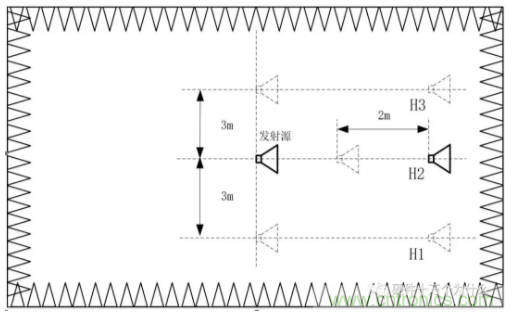 測(cè)試近場(chǎng)工作區(qū)反射電平時(shí),發(fā)射天線先置于暗室中心軸線上,接收天線置于正對(duì)被測(cè)墻壁的一個(gè)合理位置,并沿兩天線軸線移動(dòng)一段距離進(jìn)行反射電平的測(cè)試。測(cè)試位置如圖所示。