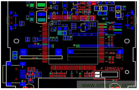 該產(chǎn)品只有一塊PCB,其上有一個12MHZ的晶體。其中超標(biāo)頻點恰好都是12MHZ的倍頻,而分析該機器容易EMI輻射超標(biāo)的屏和攝像頭,發(fā)現(xiàn)LCD-CLK是33MHZ,而攝像頭MCLK是24MHZ;通過排除發(fā)現(xiàn)去掉攝像頭后,超標(biāo)點依然存在,而通過屏蔽12MZH晶體,超標(biāo)點有降低,由此判斷144MHZ超標(biāo)點與晶體有關(guān),PCB布局如下: