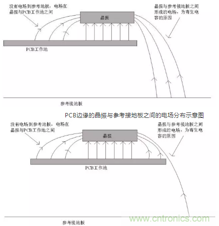 從圖中可以看出,當(dāng)晶振布置在PCB中間,或離PUB邊緣較遠時,由于PCB中工作地(GND)平面的存在,使大部分的電場控制在晶振與工作地之間,即在PCB內(nèi)部,分布到參考接地板去的電場大大減小,導(dǎo)致輻射發(fā)射就降低了。