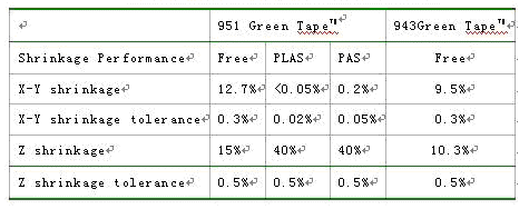 Dupont公司研發(fā)的控制收縮燒結(jié)技術(shù)已應(yīng)用于60%LTCC基板和30%的LTCC電路產(chǎn)品中。圖5為Dupont公司的控制收縮技術(shù),表4給出相應(yīng)的性能。