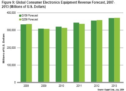 圖9所示為iSuppli對(duì)2008年至2013年期間全球消費(fèi)電子設(shè)備營收的預(yù)測。