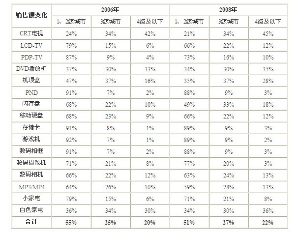 表1 2006年與2008年中國主要消費電子終端產(chǎn)品不同級別城市銷售額結構變化