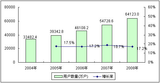圖1 2004-2008年中國移動電話用戶規(guī)模與增長