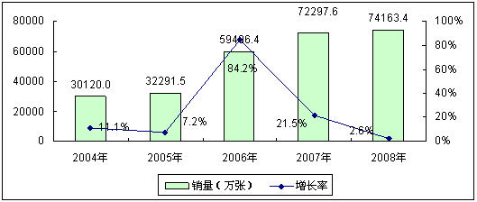 在中國移動用戶快速增長的直接帶動下,中國移動通信卡市場規(guī)模也迅速擴(kuò)大,此外,基于用戶網(wǎng)間、網(wǎng)內(nèi)換號以及SP業(yè)務(wù)的蓬勃發(fā)展也為中國移動通信卡市場的快速增長注入動力。2004年到2008年,中國移動通信卡市場銷量規(guī)模從3.0億張急劇增長到7.4億張,四年年均復(fù)合增長率達(dá)到25.3%,移動通信也成為中國智能卡應(yīng)用的最大市場。