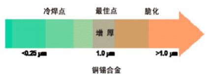 更高溫度和與被焊接部件更長時間的接觸也可能增加金屬化合物的結合層。從而不建議延長接觸時間和重復返工。上圖表顯示了隨著結合層的厚度增加,脆化現(xiàn)象發(fā)生的機率就更大。[page]
