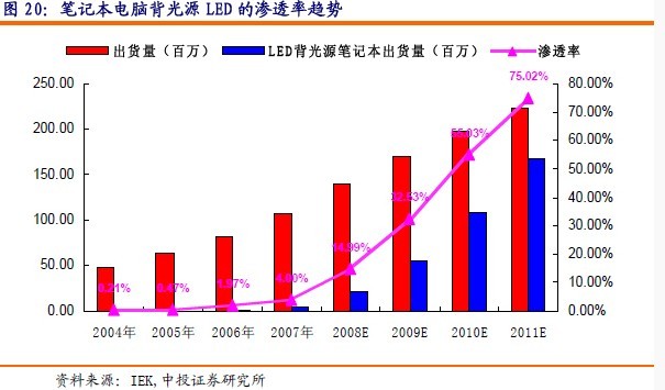 預(yù)計(jì)筆記本電腦的出貨量將從2004年的47.1百萬臺(tái)增長(zhǎng)到2011年的223百萬臺(tái),其中采用LED背光源的筆記本電腦將從2004年的0.1百萬臺(tái)增長(zhǎng)到2011年的167百萬臺(tái)左右,滲透率2011年將達(dá)到75%左右,而在2004年滲透率只有0.2%。其中每部筆記本電腦用LED顆數(shù)是40-60個(gè)。