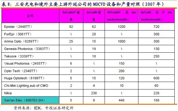 我們以截止2007年底為止,對(duì)三安光電和臺(tái)灣上游外延廠商的MOCVD設(shè)備及外延片、芯片產(chǎn)能進(jìn)行比較。
