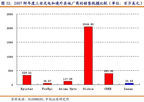 三安光電2007年的銷售規(guī)模為44.53百萬美元,其規(guī)模和臺(tái)灣的璨圓光電規(guī)模相當(dāng),但和臺(tái)灣的晶圓光電、華上光電及美國(guó)的CREE公司相比,其銷售規(guī)模還有比較大的差距。