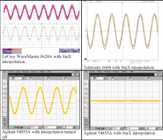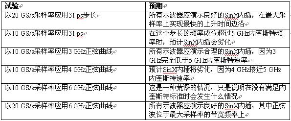 我們使用三種競爭的DSO進行簡單的試驗,其分別是力科Wavemaster 8620A、泰克6604和安捷倫54855A。這三種示波器的帶寬指標都是6 GHz,最大采樣率是20 GS/s。我們使用六種不同的信號和采樣率組合,說明SinX內(nèi)插算法的性能。
