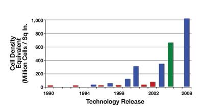 圖2顯示了Fairchild公司≤30V的N溝道MOSFET單元密度的進(jìn)步。每個(gè)條形都表示新的工藝進(jìn)步。可以看到,在最近的十年中,單元密度從3200萬單元/平方英寸增加到現(xiàn)在的10億單元/平方英寸。